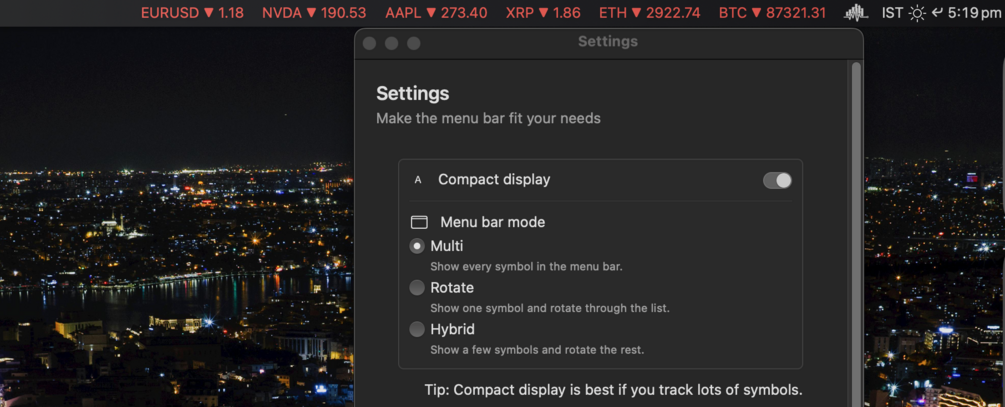 You’ll get a fast, lightweight macOS menu bar app that shows live prices for crypto, stocks, ETFs, forex, indices, gold, and more — always visible while you work. Track symbols in price-only mode or switch to portfolio mode to see real-time profit/loss based on your units and average cost. Choose between multi, rotating, or hybrid display modes, enable compact view for small screens, and fully control how much information appears in your menu bar — clean, minimal, and distraction-free.
